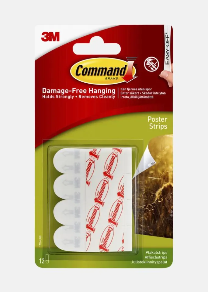 Command Poster Strips er en hurtig og nem løsning til sikker ophængning af plakater, kalendere og andre lette genstande. Ophængningsstrimlerne fastgøres let på væggen og kan bruges på de fleste glatte overflader, såsom malede vægge, malet tapet, fliser, metal og træ. De bør ikke bruges på umalt tapet, vinyltapet eller følsomme overflader.