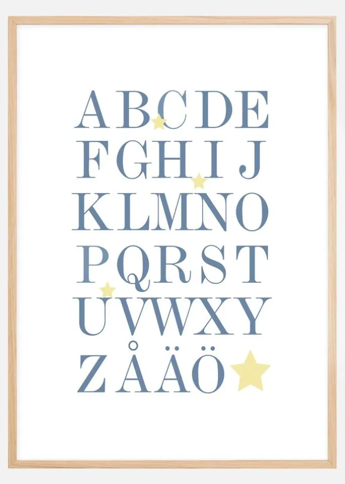 Print med hele alfabetet, A-Å, i blåt og stjerner i beige. Det pædagogiske motiv passer godt ind i børneværelset for at øve alfabetet med, men også på andre vægge i hjemmet. Det stilrene udtryk gør, at printet passer ind i alle indretningsstile og typer af hjem. Kombiner gerne med andre billeder til en billedvæg med et tema eller dekorer væggen sammen med printet med tallene 1-10.