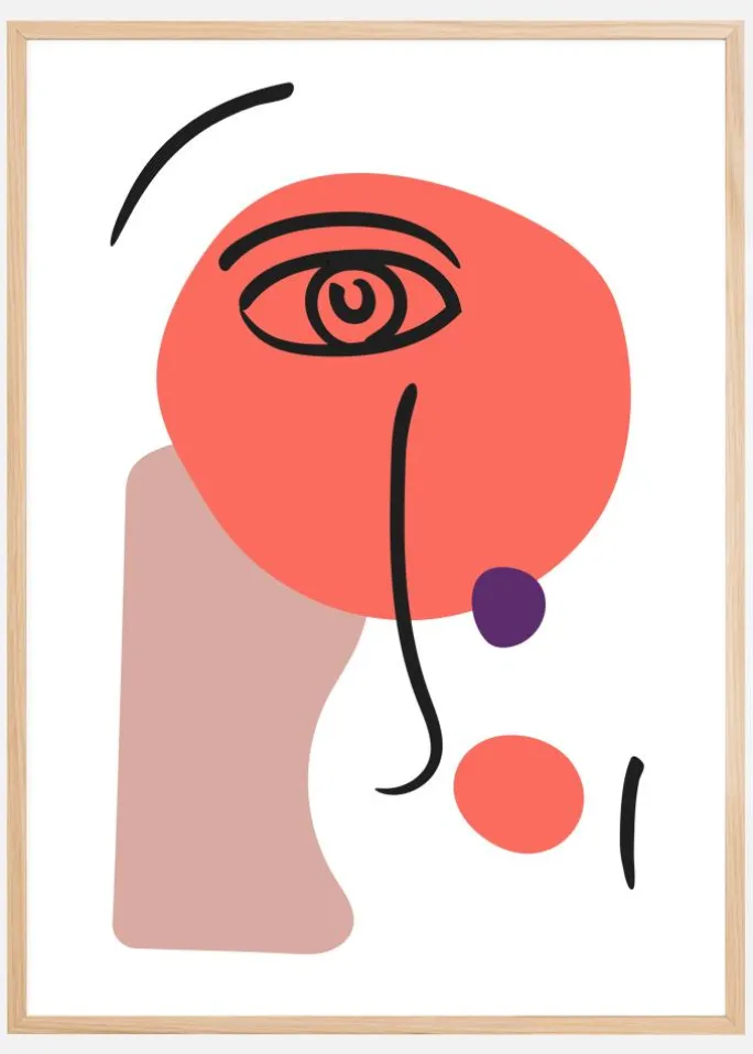 En levende abstrakt plakat med et stort sort øje i en lyserød cirkelform. Ansigtets træk er skildret på en minimalistisk måde med en lyslilla eller lyserød krop og små kikser af yderligere farve. Stir ind i øjet hver morgen, når du hænger den op på dit værelse.