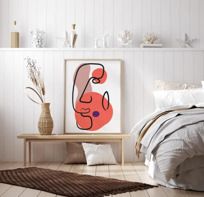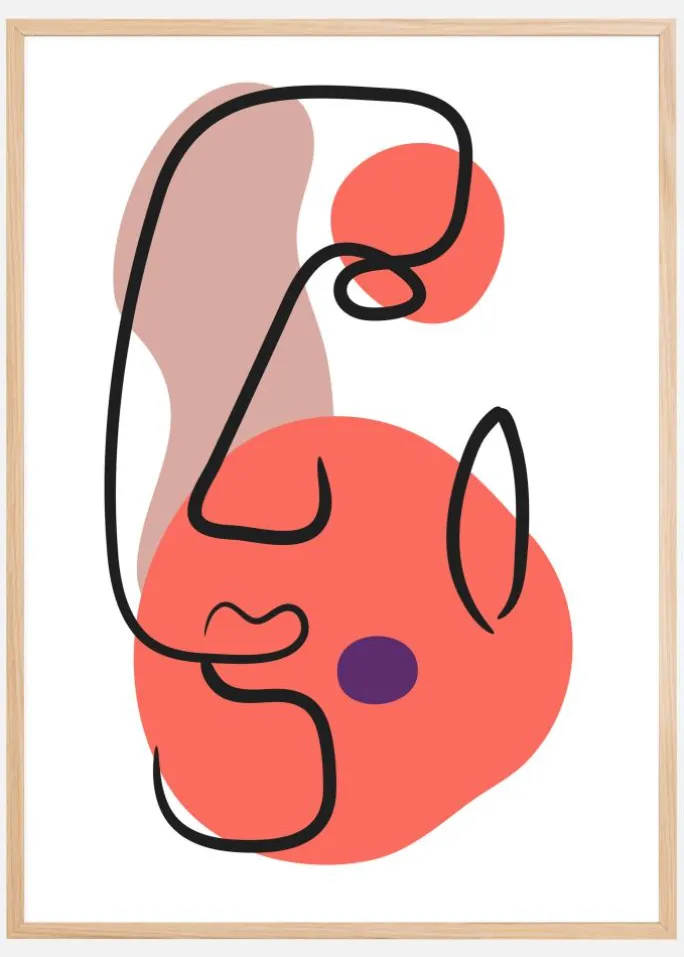 En sjov abstrakt plakat af et buttet ansigt. Ansigtet er skabt af sorte hvirvler til næse, læber og øje. De stærke linjer sidder på bløde pastelrosa og ferskenfarvede figurer, hver med en glat rund kant. Bring moderne kunst ind i dit hjem med denne dejlige plakat, der er sjov at se på.