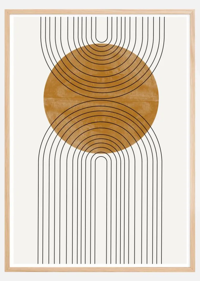 Denne plakat fanger en enestående blanding af geometri og natur med sine svepende linjer som former to overlappende halvcirkler. Den usædvanlige design skaber en følelse af bevægelse og balance, mens de varme brunlige toner giver en følelse af jordnær stabilitet. Dens rene og flydende linjer i sort kontrasterer smukt mod den lyse baggrund og den mættede brunlige farve, og skaber et billede, der er både moderne og tidløst.