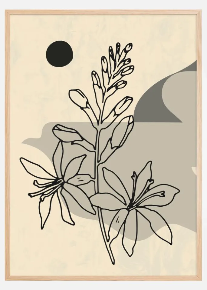 Denne æstetisk tiltalende plakat fanger en abstrakt fortolkning af blomster i blomst, hvor grafiske linjer møder organiske former. Værket spiller på en neutral baggrund i beige, kompletteret af en mørk, cirkulær form, der giver kontrast og dybde. I forgrunden strækker stiliserede blomster og knopper sig opad i silhuet, skabt med skarpe sorte konturer, der giver en stærk visuel effekt.