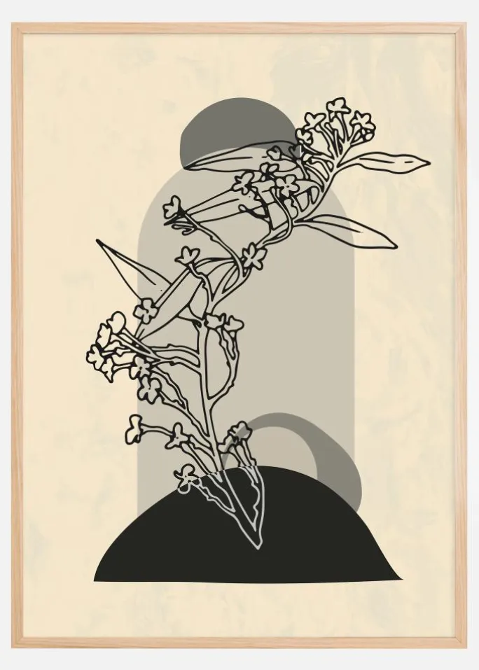 Denne sofistikerede plakat fremstiller en abstrakt blomsterstand, der kombinerer naturlige former med grafiske elementer for en nutidig følelse. Motivet anvender en subtil farveskala med bløde beige toner og dristige sorte linjer, hvilket giver en kontrast, der er både iøjnefaldende og elegant. Designet lægger stor vægt på komposition og balance, og placerer de organiske former af blomster og blade over en solid sort halvcirkel, som skaber en illusion af skygge og dybde.