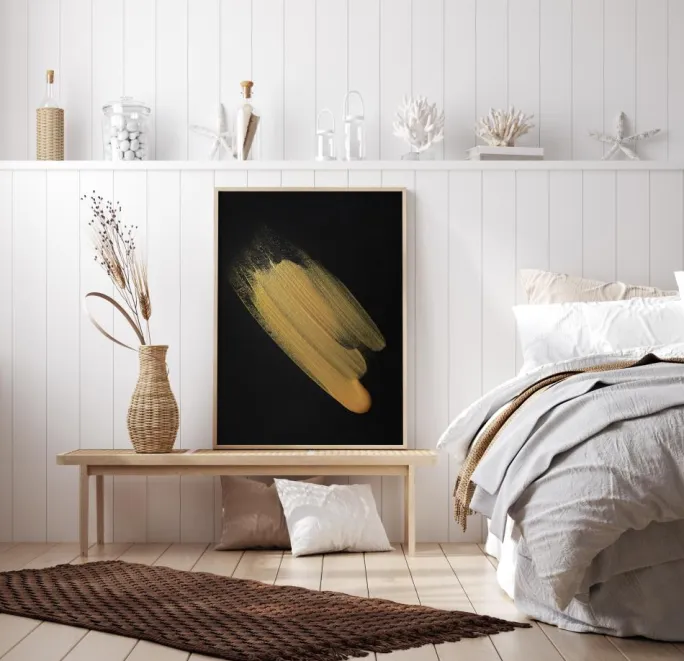 En fantastisk abstrakt plakat af en guldfarvet stribe maling på tværs af en sort væg. Penselstrøget er stærkere nederst til højre og falmer ud i øverste venstre hjørne, hvilket skaber en illusion. Den lyse farve på den sorte baggrund vil tilføje en accent til enhver mørk farvevæg i dit hjem.