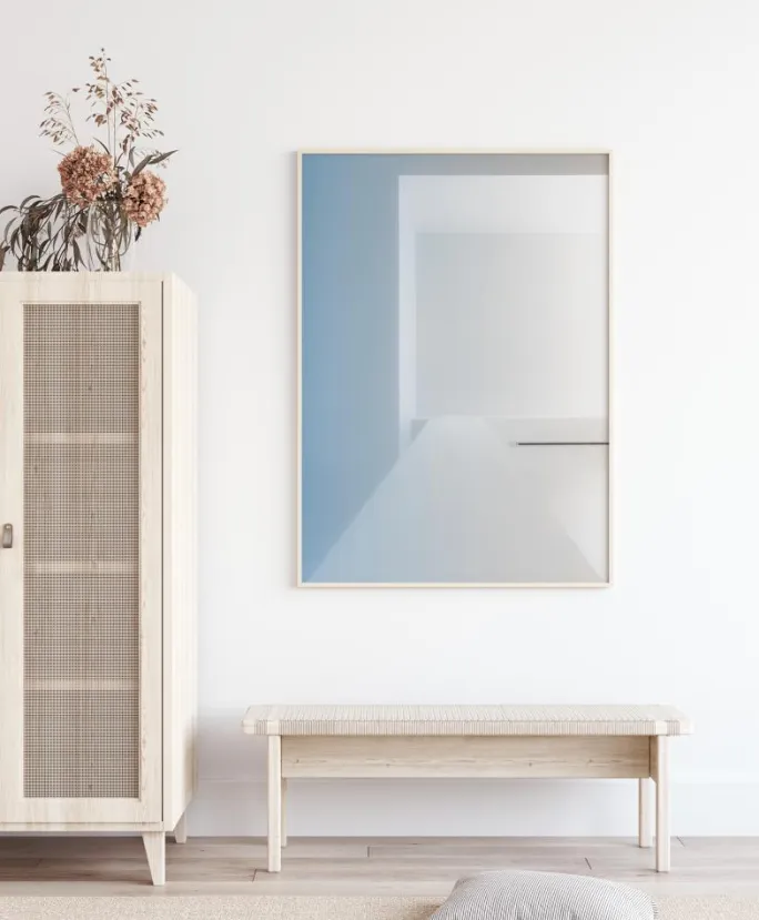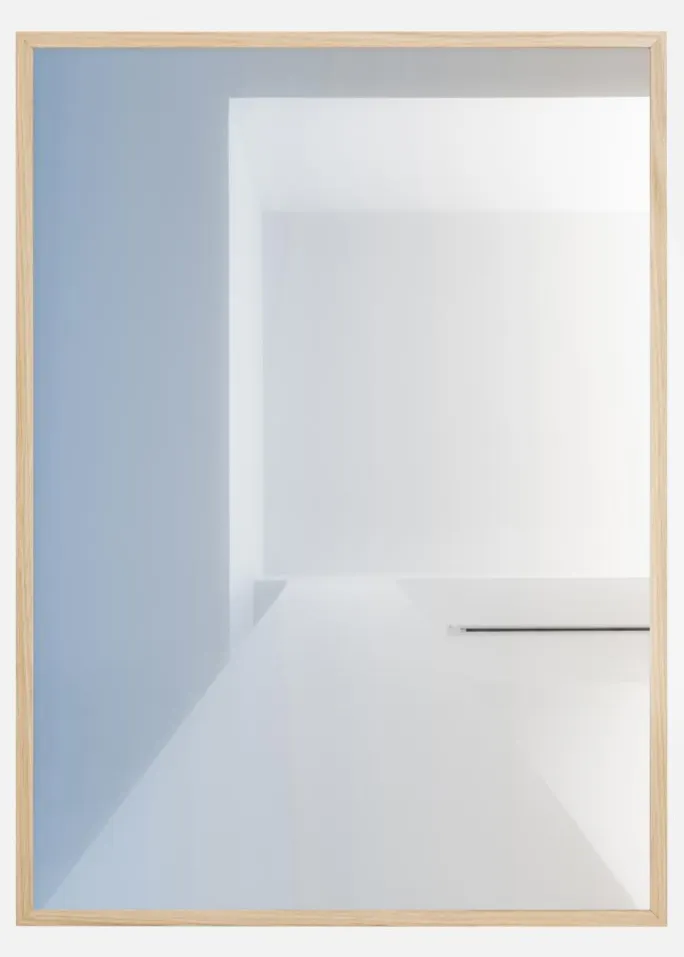 En indvendig abstrakt plakat med beroligende blå og hvide farver. Hovedbaggrunden er en blød blå med en hvid firkant, der ligner et vindue og en bordplade. Et udbrud af blødt hvidt til højre føles som solen, der bryder igennem for at skabe et stænk af ro i dit hjem.