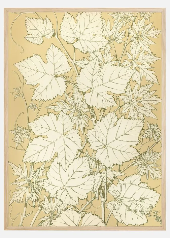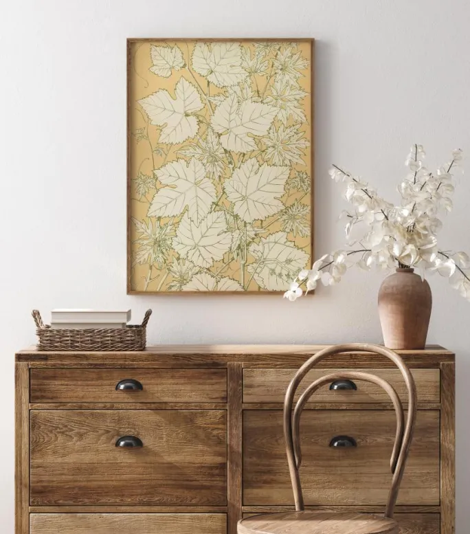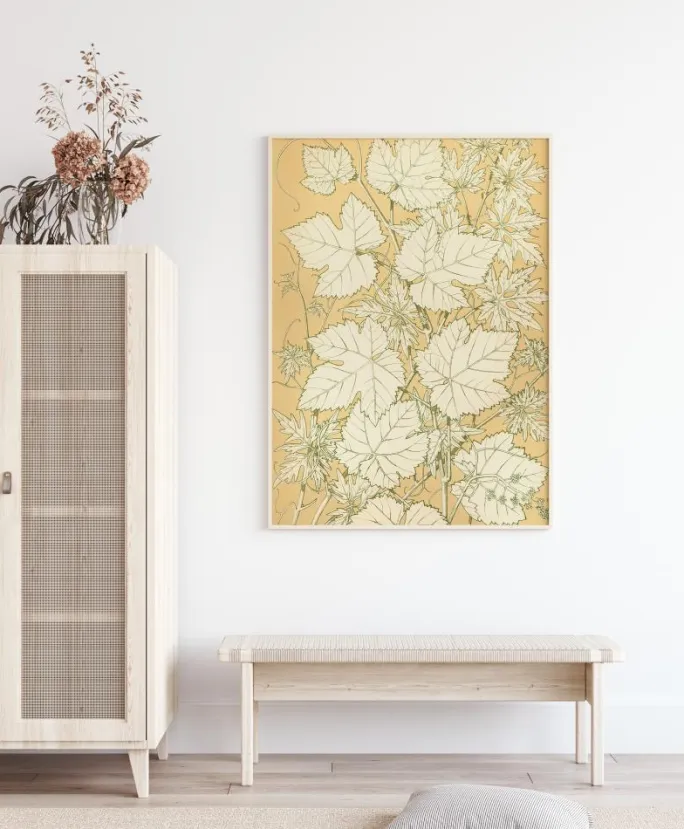 En naturplakat med blade på en pastelfarvet orange baggrund. Bladene er tegnet med sort blæk og uden farve, hvilket gør, at de skiller sig ud som et printmønster mod den ensfarvede baggrund. Oplive en almindelig væg derhjemme med denne enkle kunst i print-stil, når du bringer naturen ind i dit hjem.