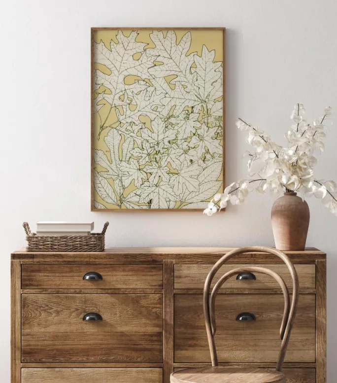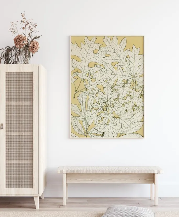 En abstrakt bladplakat med enkle tegnede blade på en lys guldbaggrund. Forskellige blade er omhyggeligt tegnet komplet med deres årer og stilke. Manglen på farve får dem til at skille sig ud fra den solide baggrund, der viser deres detaljer. Tilføj denne til en enkel væg for at skabe en naturlig følelse i dit hjem.