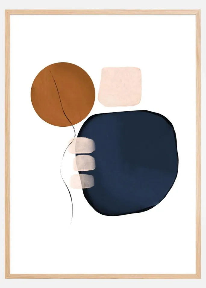 En enkel abstrakt plakat med en 3D-stil. Den store blå form trækker øjet til højre i billedet. De bløde pastelfarvede firkanter og et tyndt penselstrøg trækker øjet opad og leder øjet hen til den brune cirkel. Overvej dette billede, når du hænger det op i dit hjem.