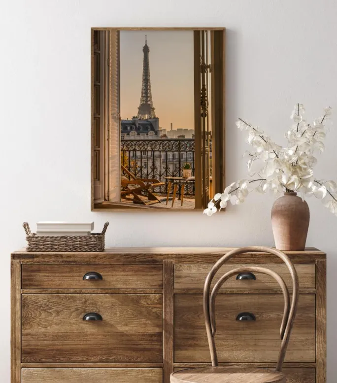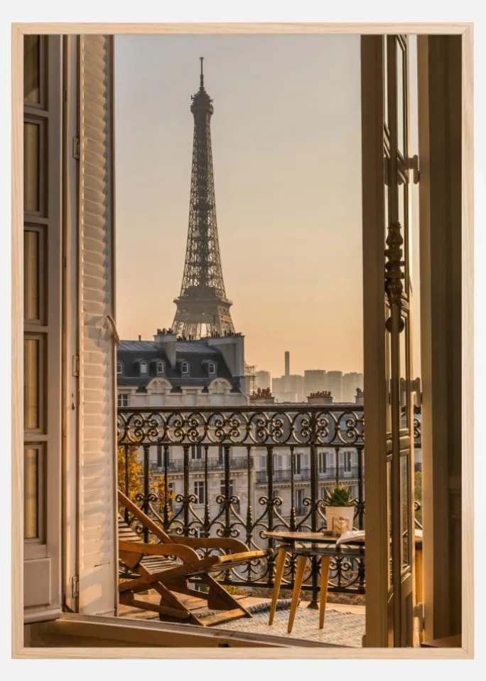 En smuk plakat med et bybillede, der viser Eiffeltårnet i det fjerne. En udsmykket balkon danner rammen om dette billede med et blødt morgenlys, der dækker stolen og gelænderet. Tårnet står højt og trækker øjet til sig. Man kan næsten mærke den kølige brise gennem de åbne døre.