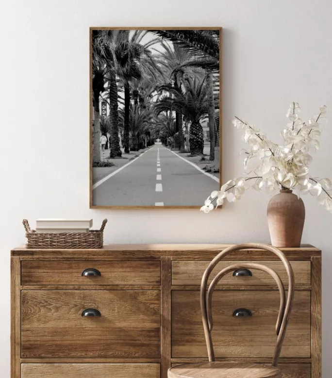 En landskabsplakat af en vejstrækning, der løber gennem en lund af palmetræer. Palmerne danner en kant til vejen, mens de hvide linjer fører dig ud i det fjerne. Træerne skaber en bue, der leder dine øjne hen. Sæt denne sort-hvide skønhed på din væg for at få en eksotisk stemning.