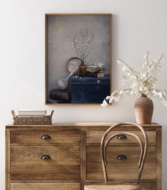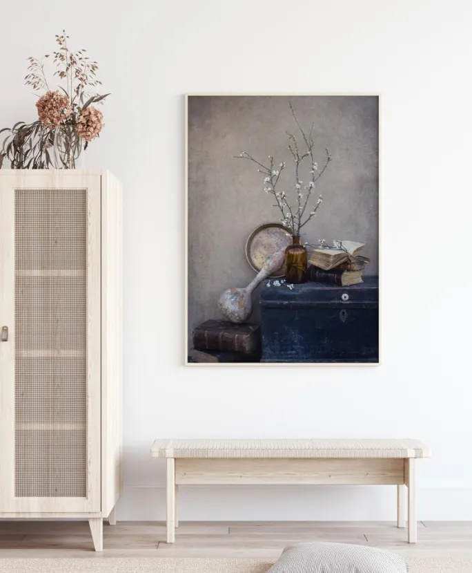 En stillebenplakat af en blå kiste med en vase, en tallerken, gamle bøger og tidlige blomster. Stillebenet er sat på en enkel grå baggrund, der får den blå kiste til at springe frem. Hvis du vil have en rustik følelse, kan du sætte dette billede på en neutral væg og nyde de tidlige forårsblomster på de nøgne kviste.