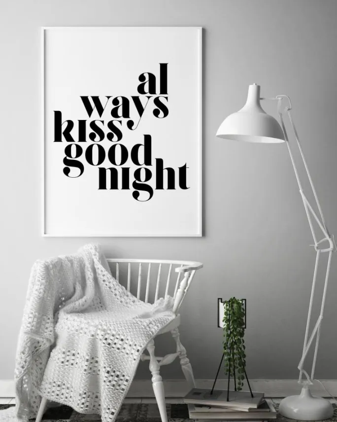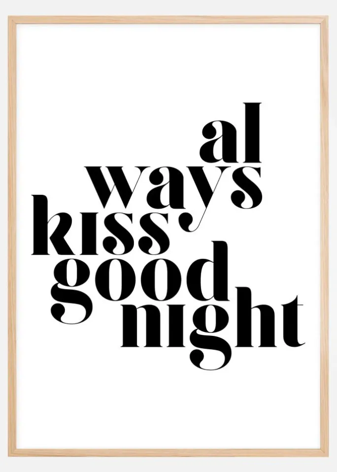 En tekstplakat med et budskab, der gør en forskel. Giv dig selv et positivt budskab om natten eller om dagen, når du kigger på denne Always Kiss Goodnight-plakat på din væg. Sæt den sammen med en fed væg, så dette inspirerende budskab hele tiden står frem for dig.