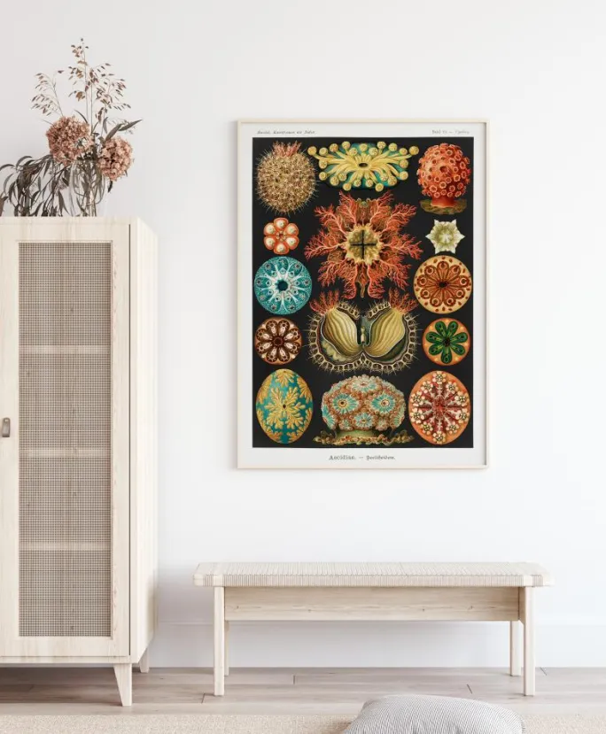 En zoologisk plakat fyldt med et mærkeligt animalium fundet på et museum. Denne lyse plakat viser en række vidunderlige skabninger fra havets dybder. Der vises udsnit af hver enkelt af dem, som viser deres mærkelige mønstre og designs for et abstrakt look. Gør denne plakat til et samtaleemne i ethvert rum.