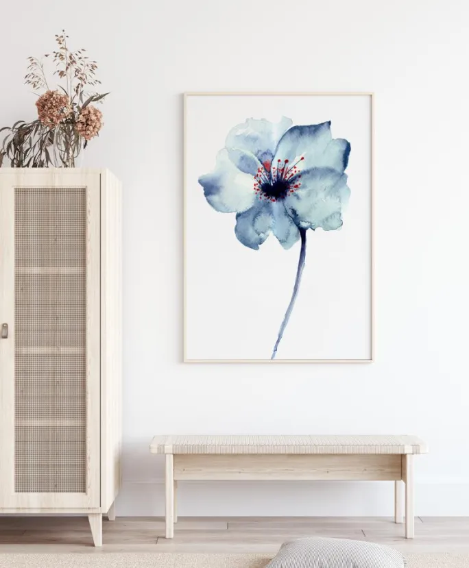 En storslået blomst malet i blå og rød akvarel. En smuk plakat i al sin enkelthed, som passer lige så godt i køkkenet eller entreen som i stuen eller soveværelset.