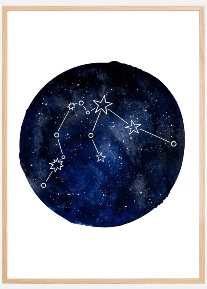 En abstrakt plakat af stjernetegnet Vandmanden. En ophængt mørkeblå globus indeholder et billede af galaksen og skitserer stjernetegnet. Kloden er placeret på en enkel hvid baggrund. Sæt den på en hvilken som helst væg derhjemme, så du kan se stjernetegnet på nattehimlen.
