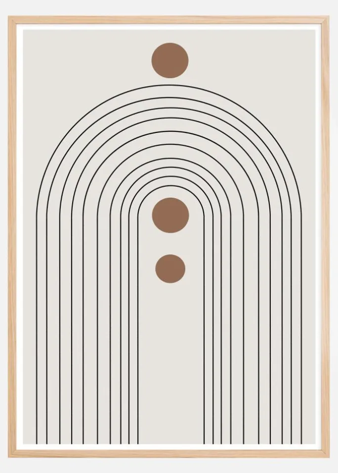Denne grafiske plakat afbilder et stiliseret buet motiv, som fremkalder følelsen af monumental arkitektur i en forenklet form. De sorte linjer danner et halvcirkelformet mønster, der skaber en illusion af dimension og dybde, mens de placerede brune cirkler tilfører et element af organisk kontrast mod den ellers strenge geometri. Dette abstrakte værk er både stramt og legende, med en harmonisk balance mellem kurver og lineære elementer.