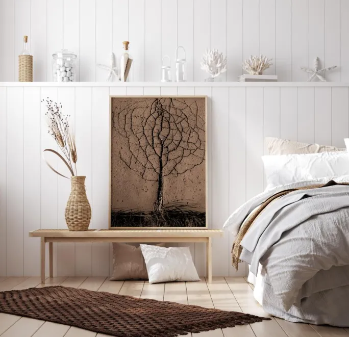 Et abstrakt billede af et træ lavet af asfalt. Den brune revne asfalt skaber en spindelvævsform, der danner en abstrakt træform. De sorte revner spiralerer udad, efterhånden som træet bliver større. Tilføj dette spændende stykke til dit hjem på en lys baggrund for at få detaljerne til at stå frem.