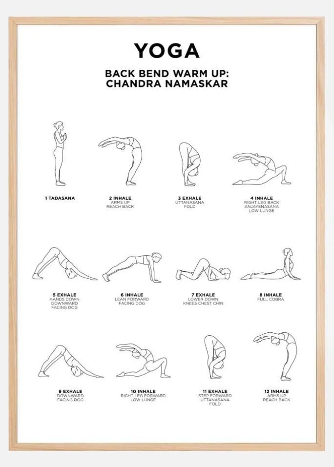 Trendy plakat som med fordel kan matches med andre motiver for at skabe en trendy billedevæg. Plakaten er stilfuld med et enkelt design, men fungerer også som en hjælpende hånd, når du vil lære en af yogas klassiske opvarmningsøvelser ”Chandra Namaskar”. Plakaten findes i sort eller hvid og i en række forskellige størrelser.
