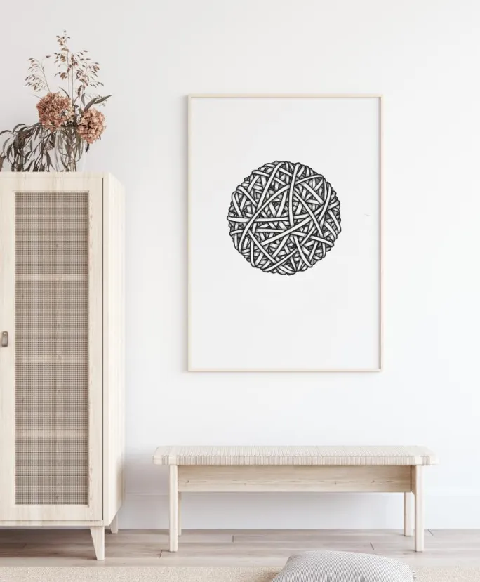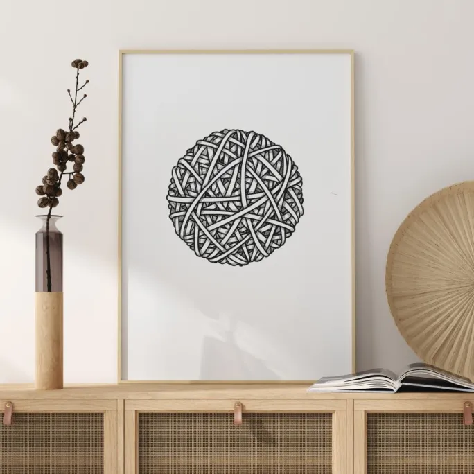 En grafisk plakat i sort og hvid af et garnnøgle formet som en bold. En enkel og minimalistisk billede, der passer fremragende til at blande med andre skønne favoritter i et større collage.