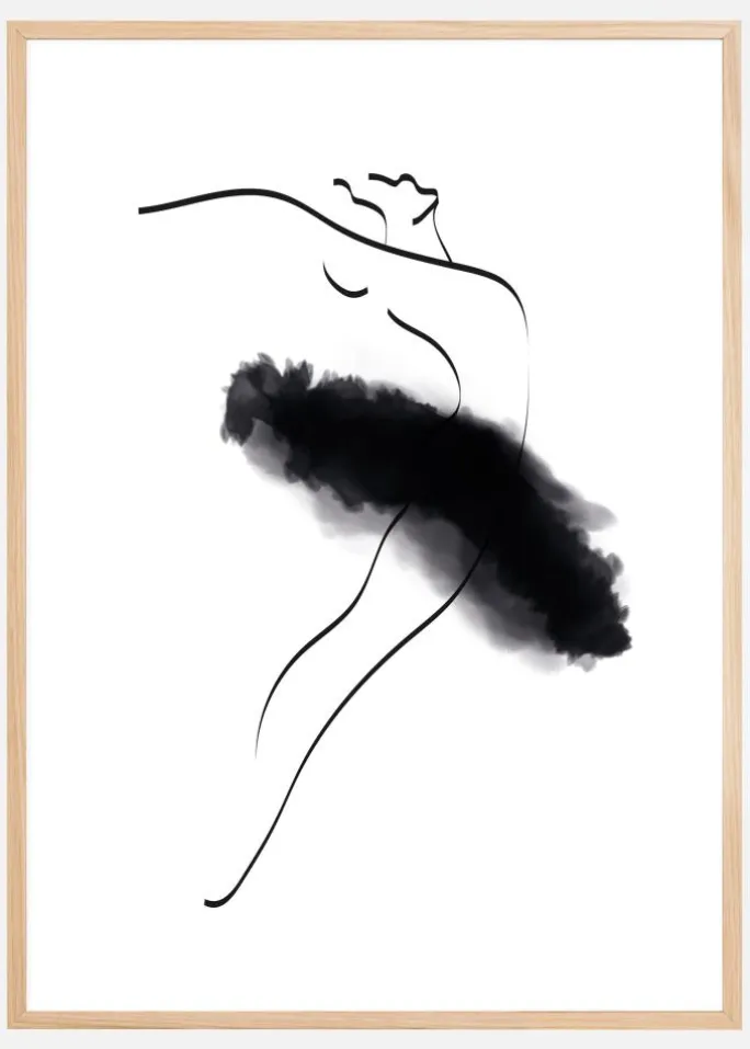 En akvarel af en ballerina i tynde sorte linjer med en mere udtalt sort ballerinakjole. En minimalistisk og stilren plakat som passer lige så godt i soveværelset eller entreen, som i stuen eller på biblioteket.