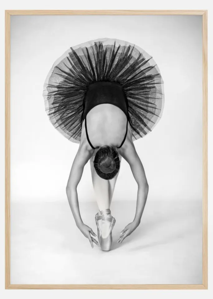 En portrætplakat af en ballerina. Denne balletdanserinde bøjer sig fremad i femte position og skaber to perfekte cirkler med sine arme og en sort tutu. Den sort/hvide plakat får hende til at skille sig ud og skaber et elegant, klassisk look, der vil løfte en enkel neutral væg hvor som helst i dit hjem.