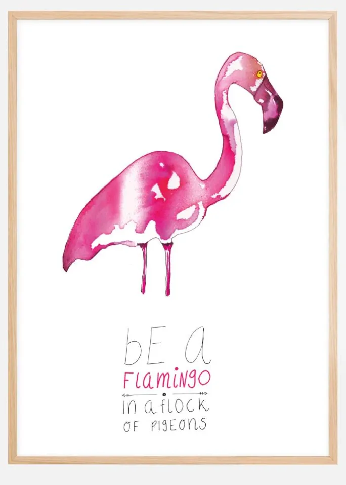 En akvarelplakat af en flamingo. Den lyse lyserøde farve på denne langbenede fugl opvejes af den bløde akvarelfarve, der er brugt. For at gøre det lidt sjovere er der også en livsbekræftelse, der opfordrer dig til at skille dig ud fra mængden. Og det vil du også gøre, når du hænger den op derhjemme!