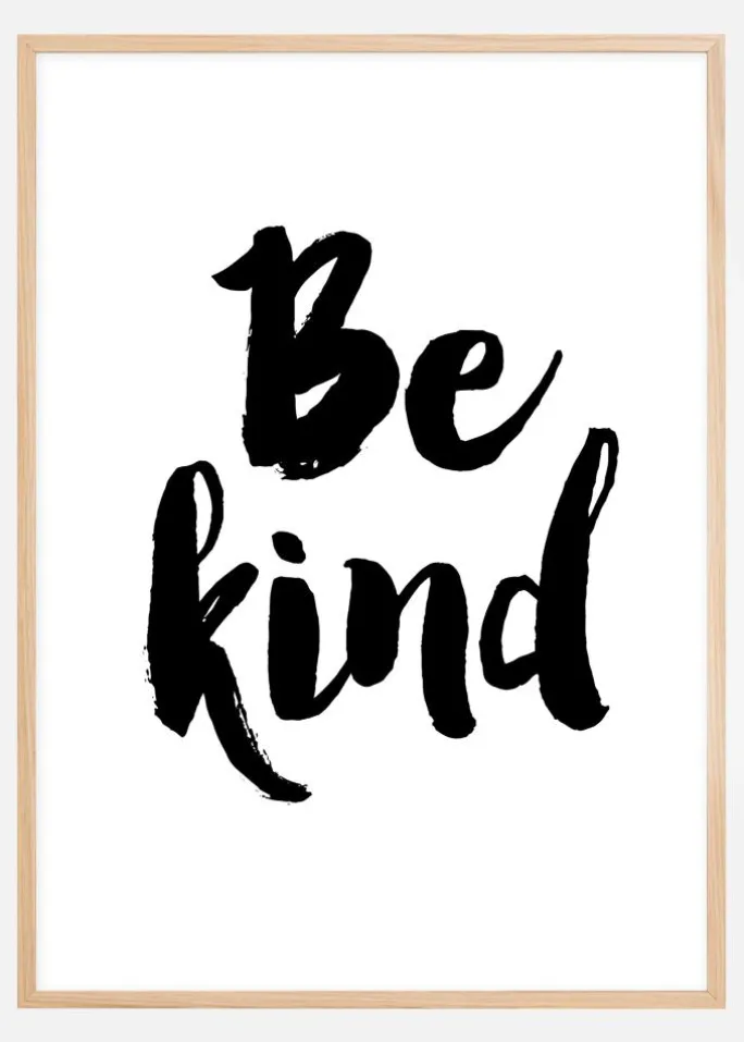 Hverdagens høje tempo og den uendelige liste over must-do opgaver gør, at vi let glemmer det allervigtigste. Vær venlig, vær god, vær rar, og du vil se, at du får dobbelt så meget godt tilbage! Denne charmerende poster tilføjer en boheme følelse til stuen, entréen eller soveværelset. Da Be Kind er i sort og hvid, er den nem at matche med dine favoritfarver. Hvad med for eksempel at indramme den med en farverig ramme eller skabe en spændende kombination med en unik passepartout? Vælg mellem 6 forskellige størrelser og prisklasser.