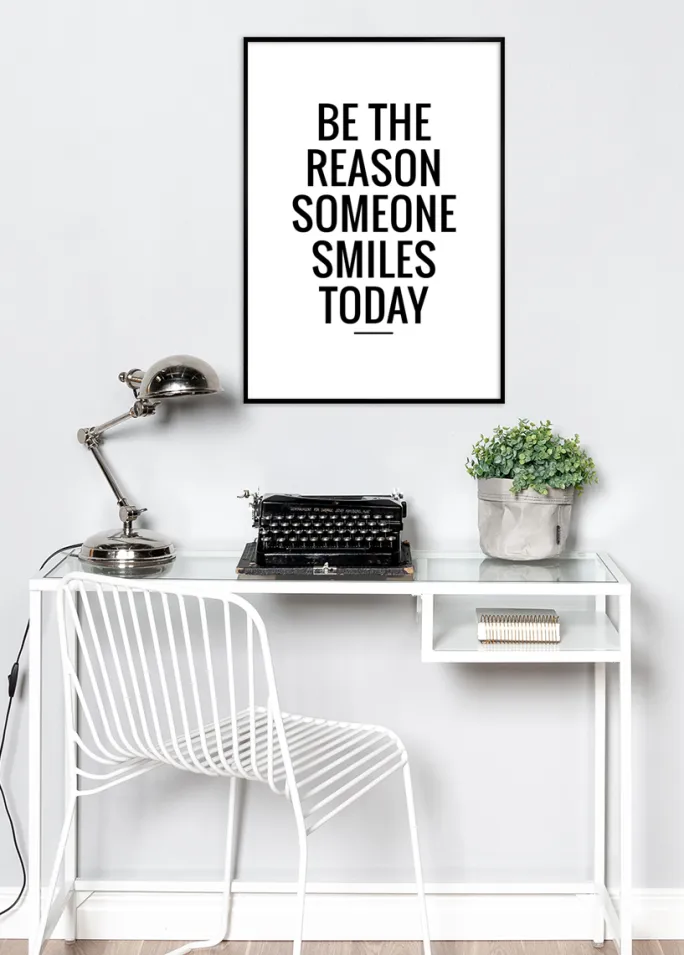 Hvad er det fineste du som medmenneske kan gøre for en anden? Selvfølgelig findes der en række forskellige handlinger at vælge imellem, men i sidste ende er det smilet du får som respons, der er det vigtigste! Denne stilfulde poster giver en fin og vigtig vejledning i hverdagen. Plakaten er hvid og har et sort tryk med teksten ”Be the reason someone smiles today”. Da den er sort-hvid kombineres den med fordel med dine favoritfarver på ramme eller passepartout. Findes i 6 forskellige størrelser og prisklasser.