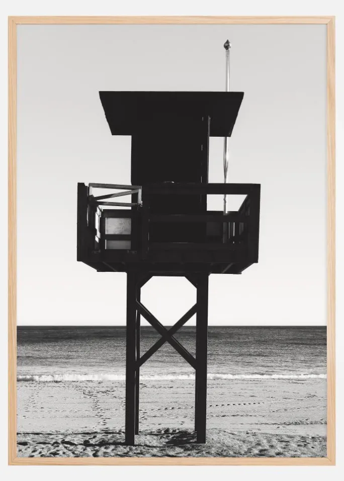 Denne monokrome plakat præsenterer en ikonisk silhuet af et strandtårn mod en klar himmel og et roligt hav. Den stærke kontrast mellem det mørke vagtårn og de lyse toner af sand og himmel giver billedet en grafisk kvalitet, der er både iøjnefaldende og tidssvarende. Billedet, som er taget i øjenhøjde, skaber en følelse af nærvær og ro, som om man står direkte på stranden og kigger ud over det vidtstrakte hav.