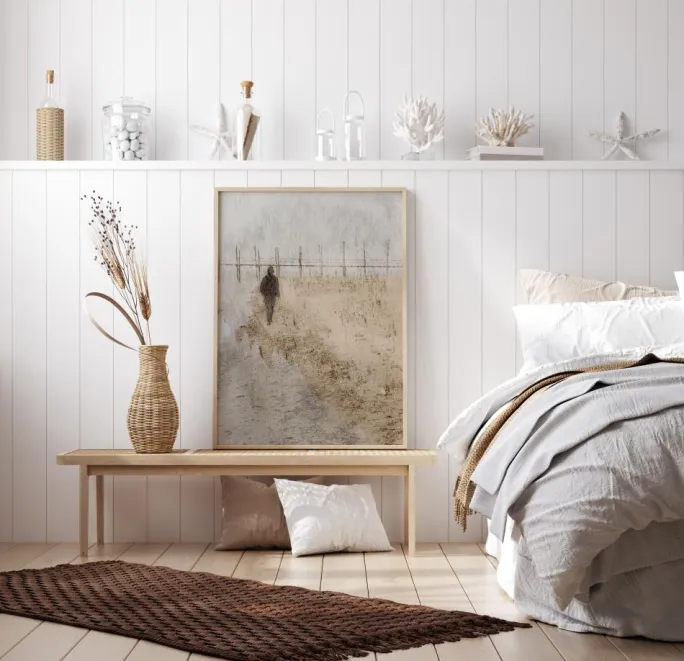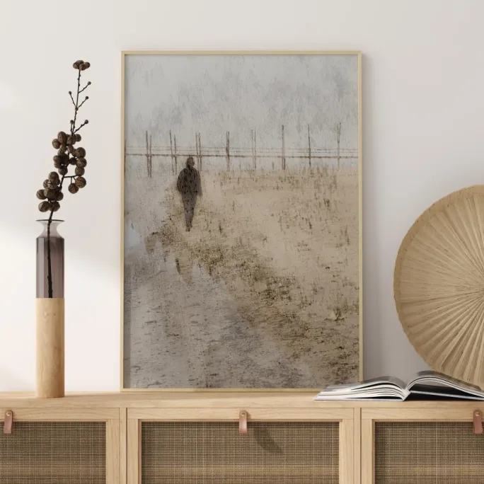 En malerisk plakat af en strandvandring. En brun figur går langs en teksturel gul og grå strand. Et hegn afgrænser den øverste tredjedel for at skabe en stærk horisont og en følelse af afstand. De bløde brune nuancer i dette pastelfarvede værk vil passe perfekt til en pastelfarvet væg og tilføre varme til dit hjem.