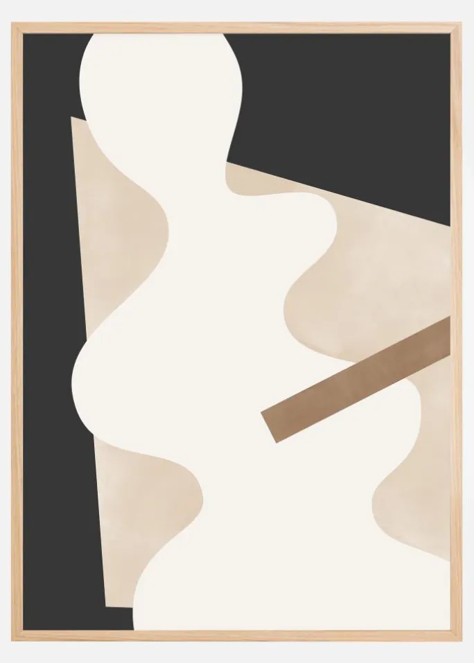 Denne plakat præsenterer en fascinerende blanding af former og nuancer, der leger med beskuerens opfattelse. Med en blød og fejende kurve, der dominerer motivet, skaber den en næsten skulpturel fornemmelse mod den sorte baggrund. De beige og cremefarvede former flyder ubesværet, krydset af et lineært brunt element, der bryder de afrundede konturer. Denne stilrene plakat tilbyder en følelse af bevægelse og yndefuld balance, hvilket gør den ideel til en minimalistisk indretningsstil, der alligevel søger et udtryksfuldt og tankevækkende indslag.