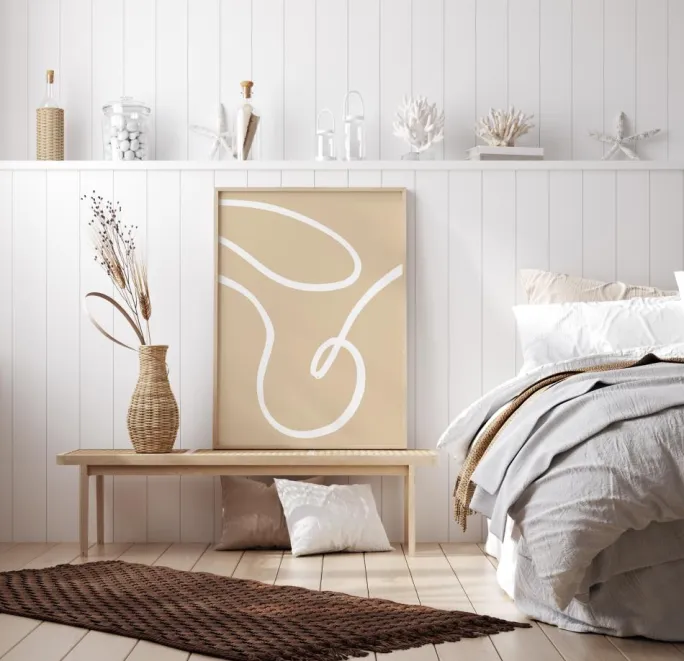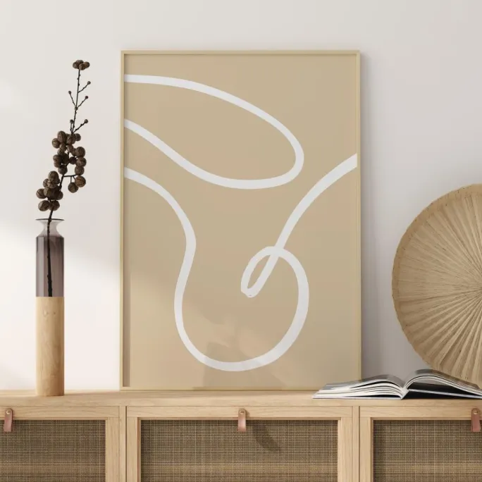 En simpel stregtegningsplakat, hvor de cremefarvede linjer spiralerer hen over den beige baggrund for at skabe mønstre, der kan sætte gang i fantasien. Se og forestil dig, hvad du vil, når du stirrer på dette værk. For at give den et ekstra pift kan du sætte den på en væg i en fed farve i dit hjem.