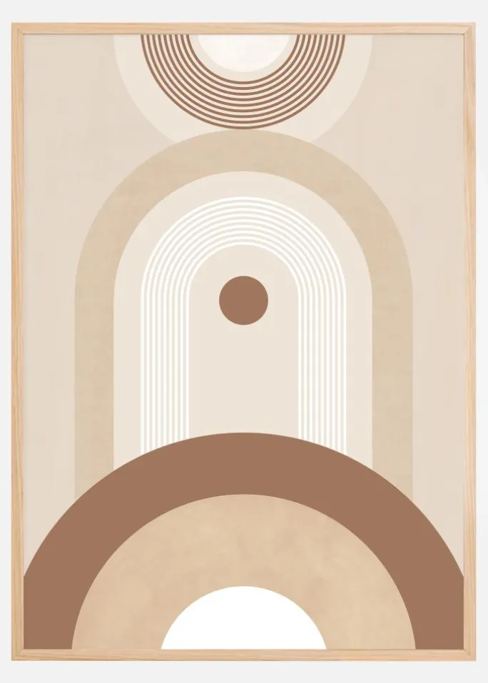 Udforsk geometriens og minimalismens skønhed med denne distinkte plakat, en del af vores kuraterede kunstsamling. Denne print, inspireret af mid-century modern æstetik, kombinerer cirkulære former og linjer for at skabe en følelse af balance og harmoni. De bløde beige og brune toner i denne plakat formidler en følelse af ro og er perfekte til at skabe en afslappet og elegant atmosfære i ethvert rum.