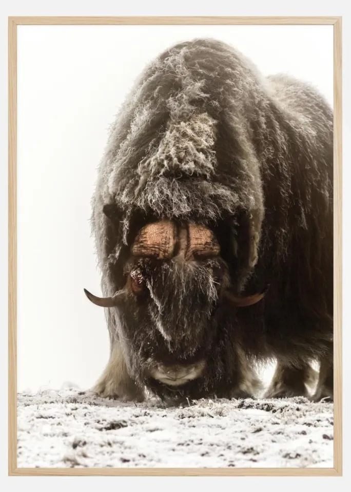 En dyrelivsplakat af en snedækket yak. Yakens lange brune pels ser blød og frodig ud, mens han vender sig mod kameraet og leder efter mad. Den snehvide baggrund får ham til at skille sig ud og tilføjer dramatik til billedet. Sæt den på din væg for at få et strejf af vinter.