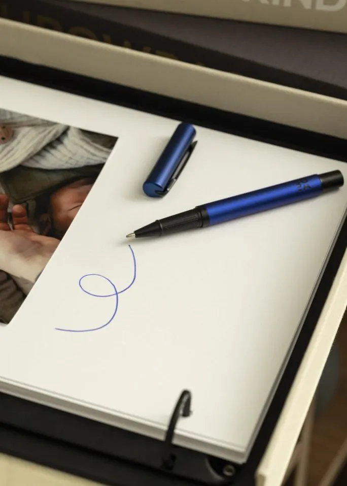 Albumpen i blå farve med metalskinnende effekt – perfekt at anvende på albumsider og fotografier. Pennen har en spids med en bredde på 1 mm.