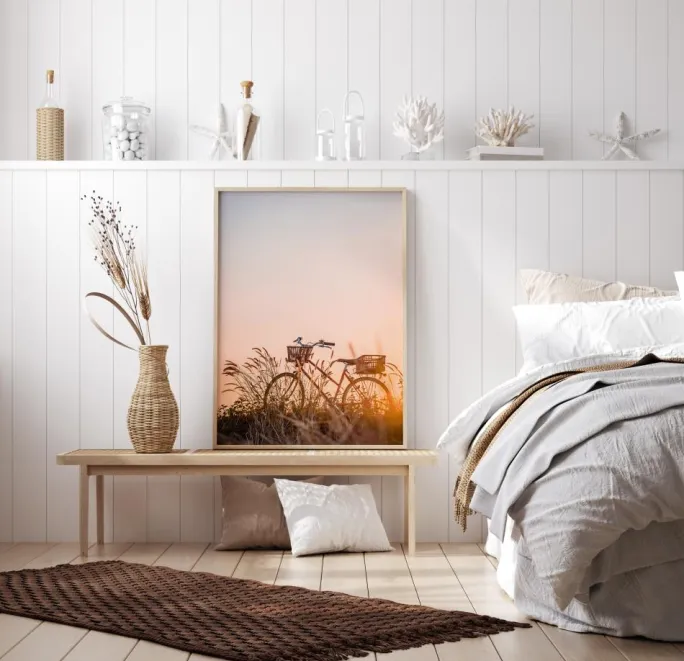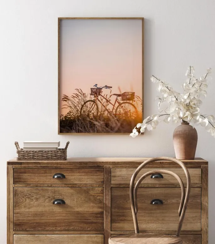 En enkel plakat med en cykel i en hvedemark. Dette magiske billede bliver mere æterisk, når solen går ned bag cyklen og stråler gennem hvedestænglerne. Den klare blå himmel er blød og reflekterer solnedgangen. Sæt dette op derhjemme og bring fred på dine vægge.