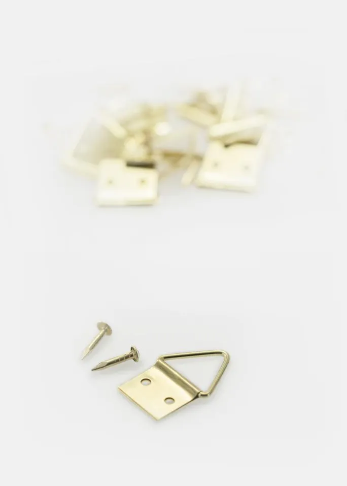 Triangelophæng i messing, der monteres på rammens bagside. Du kan bl.a. anvende to ophæng sammen med en wire, men kan også nøjes med et enkelt. Dette ophæng er velegnet til de lidt mindre billeder (max. mål 40×50 cm).