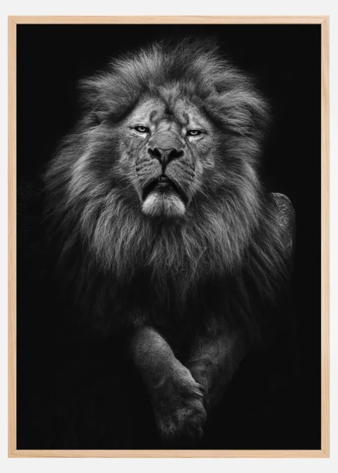 Denne mægtige plakat i sort/hvid fanger en løves majestætiske tilstedeværelse med en næsten håndgribelig følelse af styrke og værdighed. Motivet er en kraftfuld fremstilling af junglens ukronede konge, hvor hver detalje i dens mægtige manke og dybden i dens blik er fanget med enestående skarphed. Kontrasten mellem de mørke og lyse nuancer forstærker den dramatiske effekt og giver dette print en tidløs elegance, der gør det til en ideel indretningsdetalje for alle, der værdsætter vildmarkens skønhed.