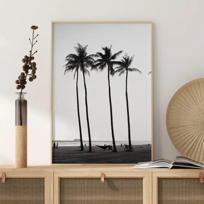 En elegant plakat med fire høje palmer i silhuet mod den gule himmel på stranden. Ved palmernes fod er der en hængekøje og en cykel sammen med mennesker, der står og kigger på havet, mens de nyder udsigten. Bring denne slående udsigt også ind i dit hjem, når du får denne plakat.