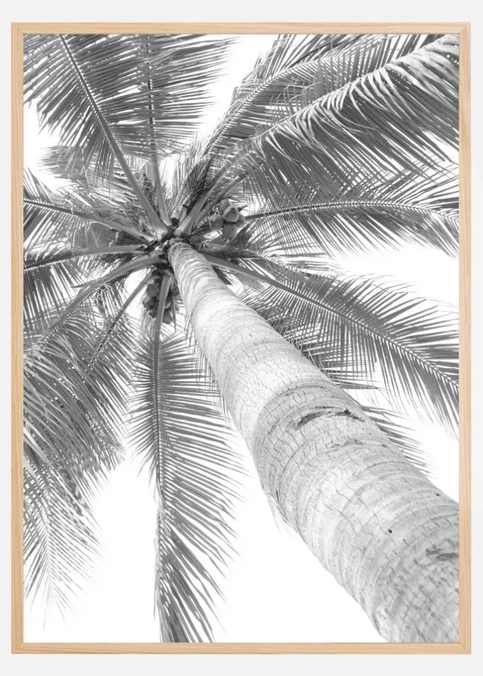 Denne minimalistiske og elegante sort-hvid plakat viser en palme fra et usædvanligt perspektiv, med blikket rettet opad mod himlen. Kontrasten mellem palmens detaljerede løv og den glatte bark skaber en dynamisk tekstur, der indfanger essensen af tropisk skønhed. Den sort-hvide behandling tilføjer en tidløs og sofistikeret følelse, der hæver enhver rums indretning.