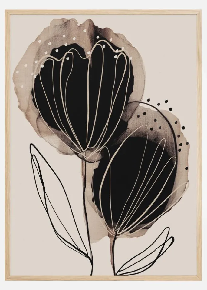 Farvepaletten er begrænset men kraftfuld, med sorte og hvide detaljer, der fremhæver blomsterformernes grafiske linjer mod en jordnær farvebaggrund. Denne print er perfekt til at tilføje et nutidigt strejf til ethvert rum, og er særligt fremtrædende i minimalistiske eller moderne miljøer, hvor dens stilrene skønhed kan være i centrum.