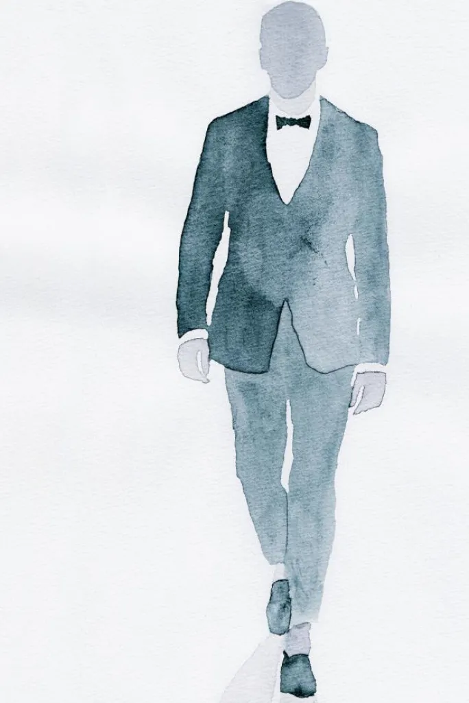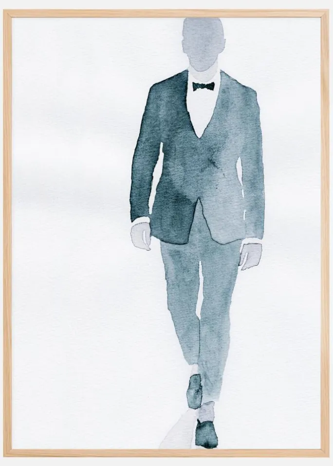 En portrætplakat af en mand i smoking, der går fremad. Dette enkle, men effektive blå wash-maleri giver dig figuren uden at vise nogen detaljer i hans ansigt. Hvem er den mystiske mand? Det er op til dig at afgøre, når du tager denne med hjem.