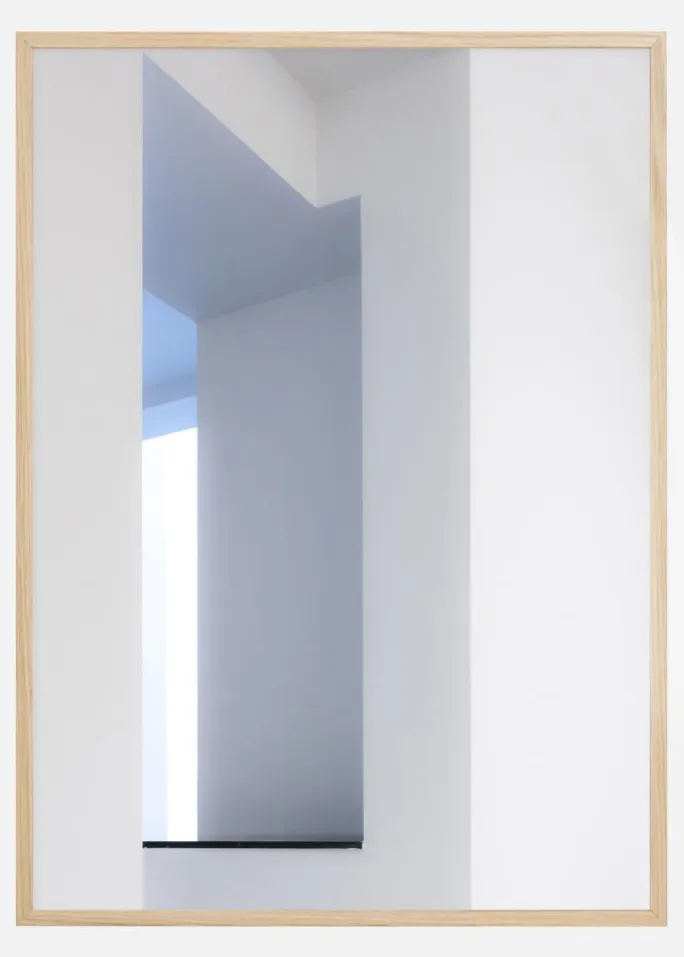 En interiørplakat af vægge og et vindue. De hvide og grå vægge og geometriske former leder øjet hen til vinduet og den lyse hvide væg og den blå himmel, der er bagved. Hæng denne op i et mørkere rum for at bringe følelsen og illusionen af lys og rum til at lyse det op.