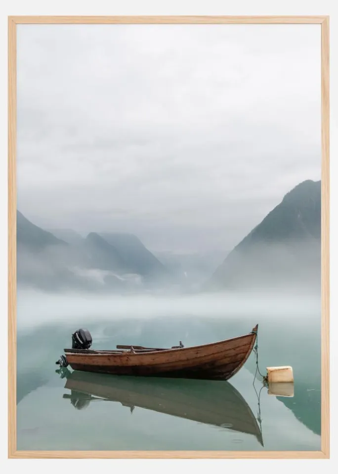 En elegant plakat af en båd midt på en tåget sø. En brun båd ligger i klar detalje i forgrunden, og dens refleksion er skarp på vandoverfladen. I baggrunden bag tåge forsvinder bløde bjerge, der rejser sig op fra vandet. Bring roen fra det åbne rum ind i dit hjem.
