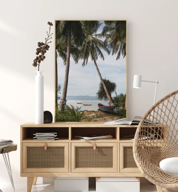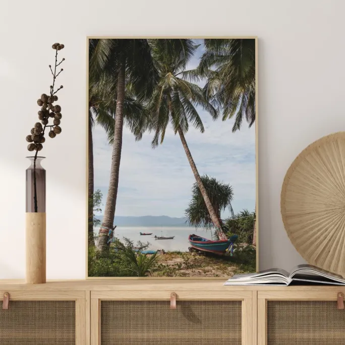 En ferieplakat med palmer og både i Thailand. To palmer læner sig ind mod hinanden og indrammer havet bagved, hvor to både ligger. En tredje rød og blå båd ligger på land og trækker øjet indad. Forestil dig, at du er på stranden i dette rolige billede.