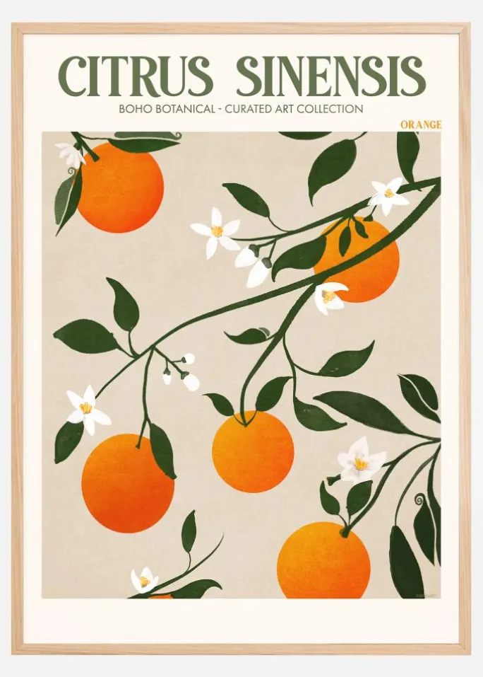 Denne plakat fra ‘Boho Botanical – Curated Art Collection’ fanger skønheden af Citrus sinensis, også kendt som søde appelsiner. Dens minimalistiske stil fremhæver frugtens ikoniske farve og form, sammen med de delikate hvide blomster og det frodige grønne løv, som tilsammen skaber et elegant og rent design.