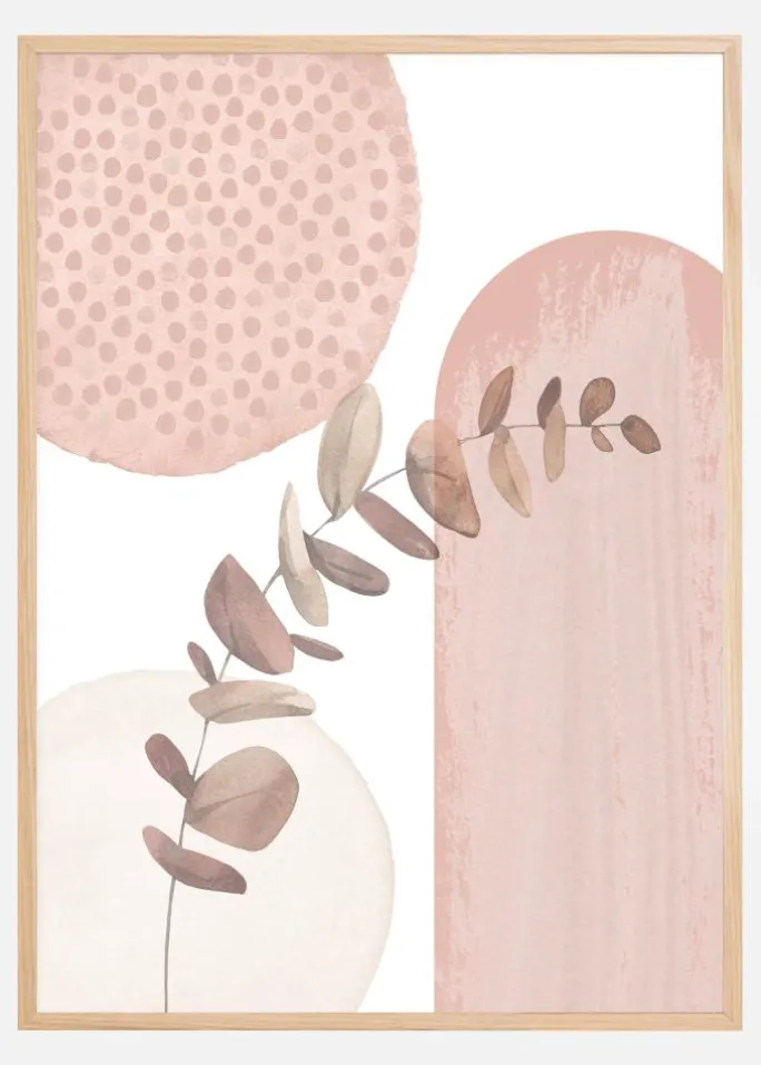 Denne rolige og stilrene plakat viser en sofistikeret og minimalistisk blomsterillustration i en behagelig palet af lyserøde og neutrale toner. Motivet, som synes at flyde over flere abstrakte former, er både moderne og tidløst. En enkel plantegren med elegante blade strækker sig over kompositionen, mens baggrunden af cirkulære mønstre og bløde farver skaber en følelse af rum og dybde. Denne kunsttryk er en fremragende interiørdetalje for alle, der sætter pris på rolige farver og subtilt design i deres hjem.