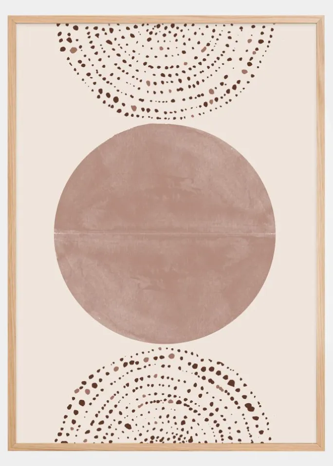 Denne sofistikerede og beroligende plakat fremhæver en stor, blød terrakottafarvet cirkel som centrum i en komposition af fine, spredte prikker, der danner svævende halvcirkler ovenfor og nedenfor. Dette motiv er inspireret af boheme design og giver en afslappet, jordnær følelse samtidig med, at det tilfører et moderne touch til rummet den pryder.