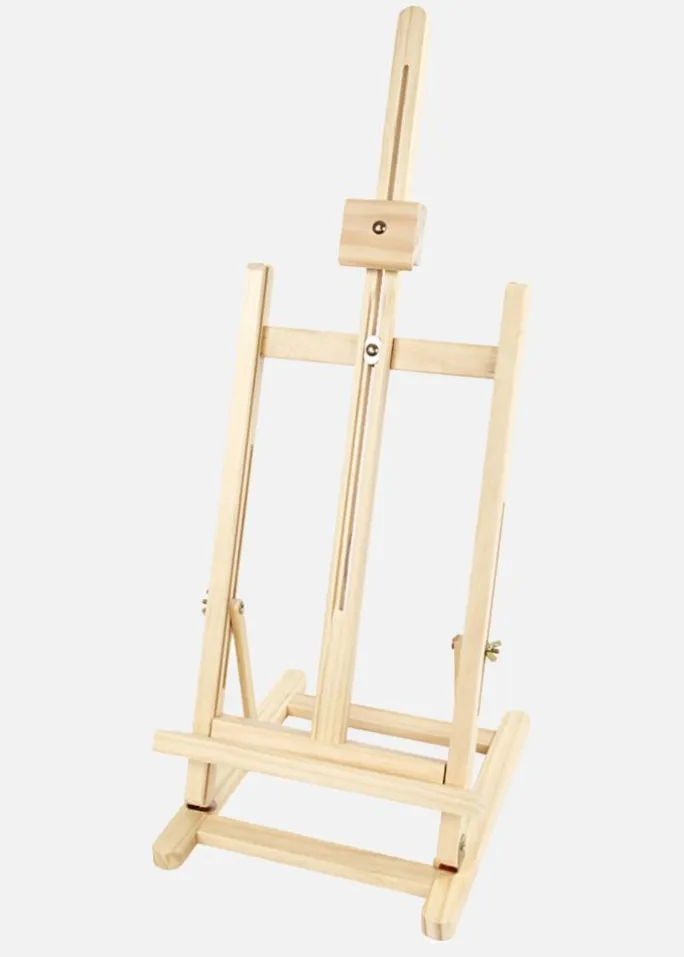 Staffeliet er lavet af træ og har en justerbar holder, der gør det let at tilpasse vinklen efter dine behov. Perfekt til både maling, udstilling af kunstværker eller som en elegant præsentationsløsning for billeder og malerier.
