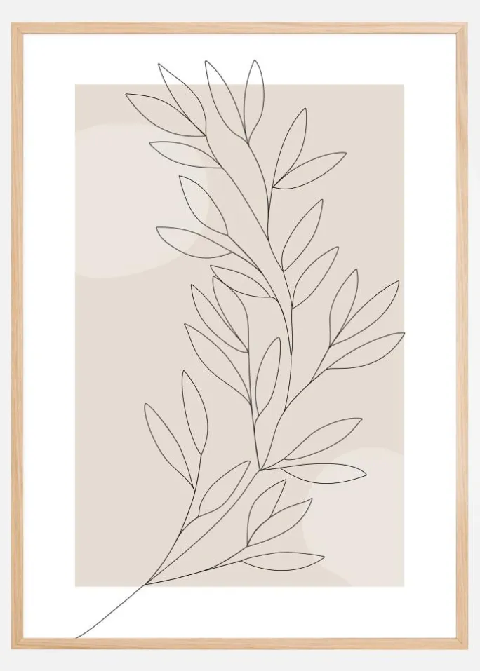 En enkel printplakat med blade på en grå baggrund. Følg kurven på denne enkle bladgren-linjetegning, som leder dit øje rundt om værket. En lysegrå cirkel er solen i dette gråtonede værk. Tilføj til en lys baggrund for at give farve og liv til dette værk.